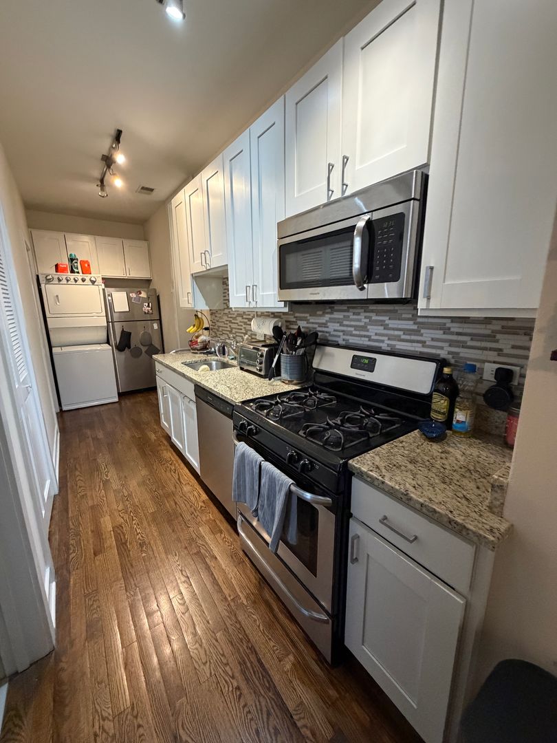 Step into this stunning 2-bedroom, garden unit featuring modern upgrades throughout. Enjoy a stylish kitchen with granite countertops, stainless steel appliances (including dishwasher and microwave), and sleek chocolate hardwood floors throughout. Both bedrooms offer spacious closets, providing plenty of storage. An in-unit stacked washer and dryer adds everyday convenience, while the central HVAC system ensures year-round comfort. Street parking available with city permit. Don’t miss out on this gem in the heart of Lakeview!