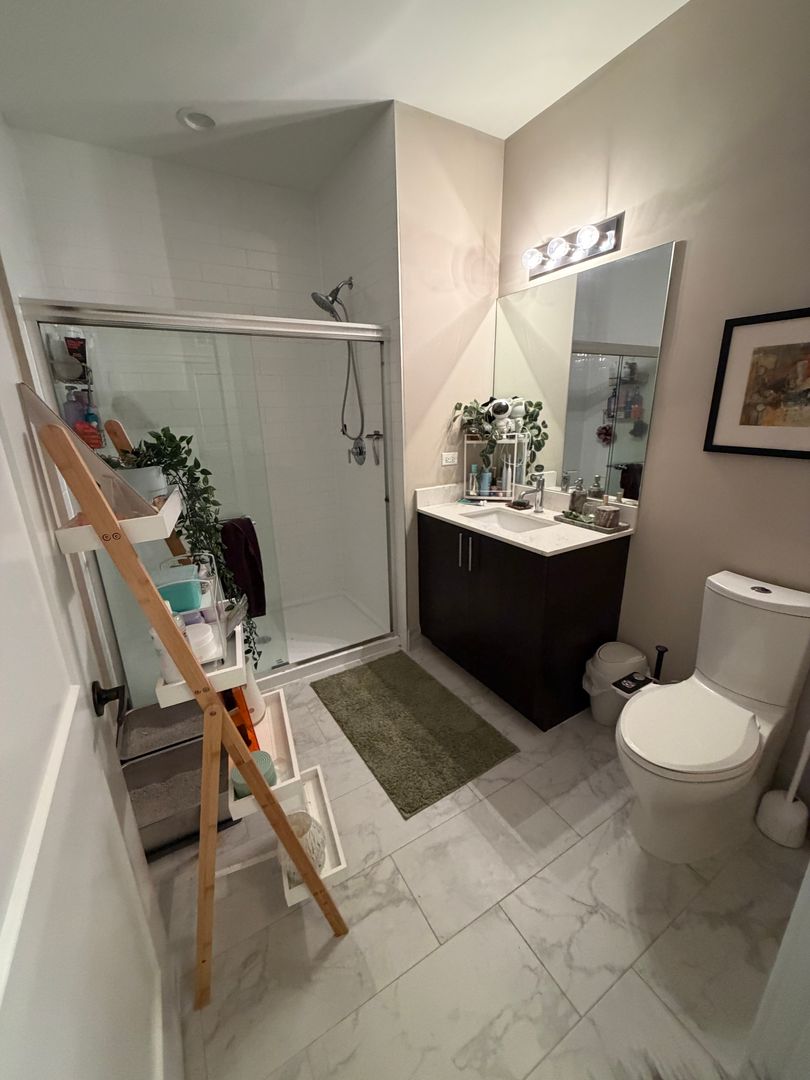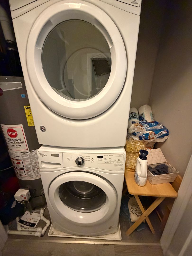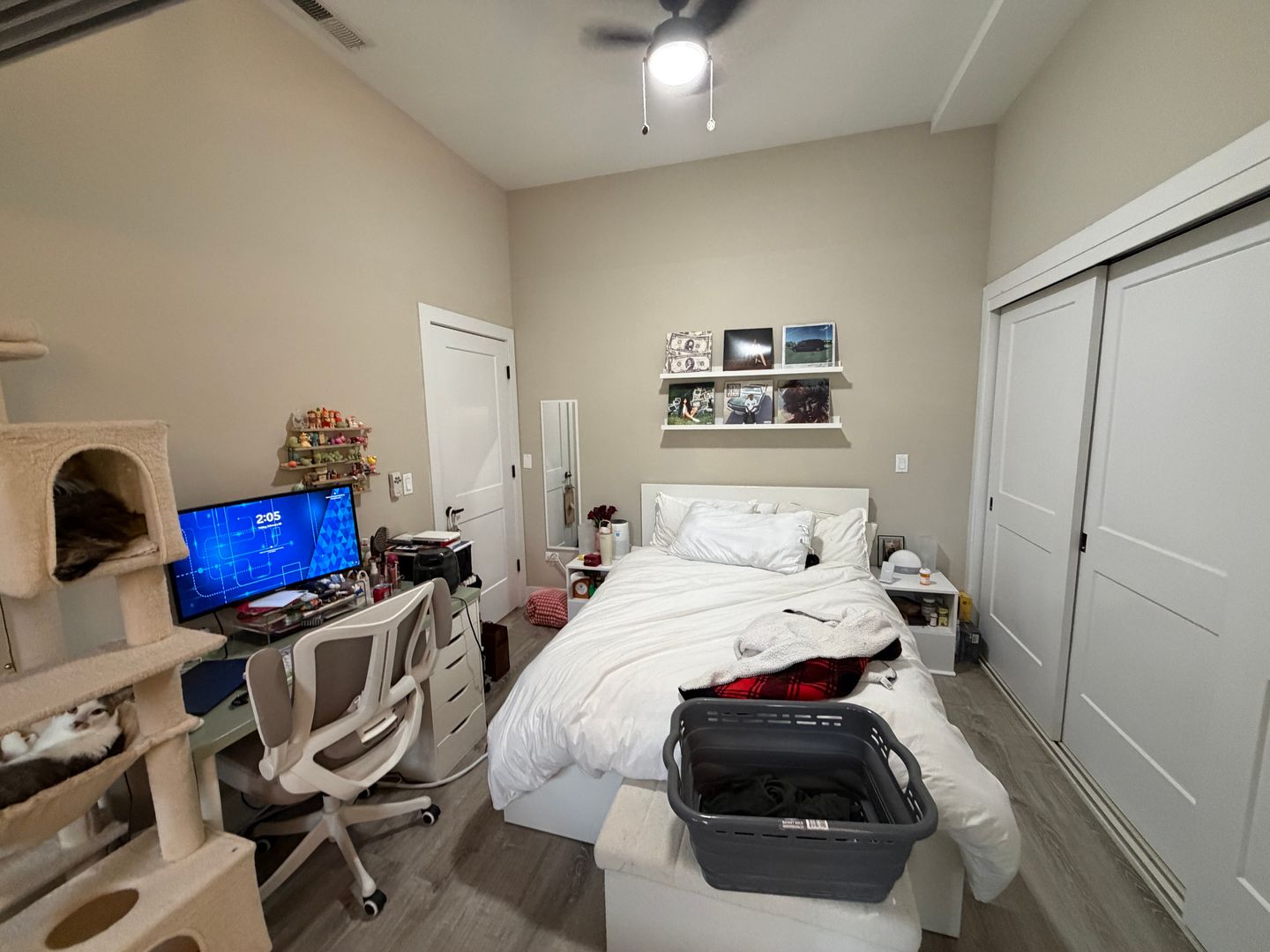 Modern 1-bedroom, 1-bathroom apartment featuring an open floor plan that extends to a private balcony. The kitchen is equipped with stainless steel appliances, including a dishwasher and microwave, while a coat closet in the hallway adds extra storage. Comfort and convenience are top of mind with central HVAC, in-unit laundry, and included internet service. The bedroom and living room are separated by a wall with a sliding door, allowing you to enjoy the privacy of two distinct rooms or the flexibility of an open-concept space. Located in a modern elevator building, residents also enjoy convenient amenities such as a dog wash station and bike racks in the garage.