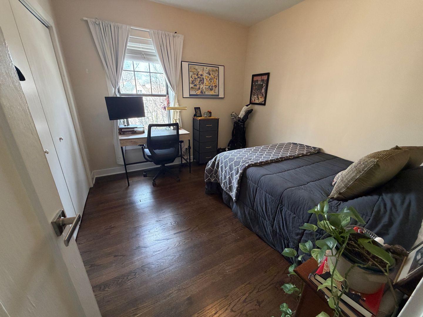 This spacious top-floor 2-bedroom, 1-bath apartment offers central air and heating, in-unit laundry, and access to a shared deck. The modern kitchen features stainless steel appliances, including a dishwasher and microwave. Both bedrooms include spacious closets, and street permit parking is available.